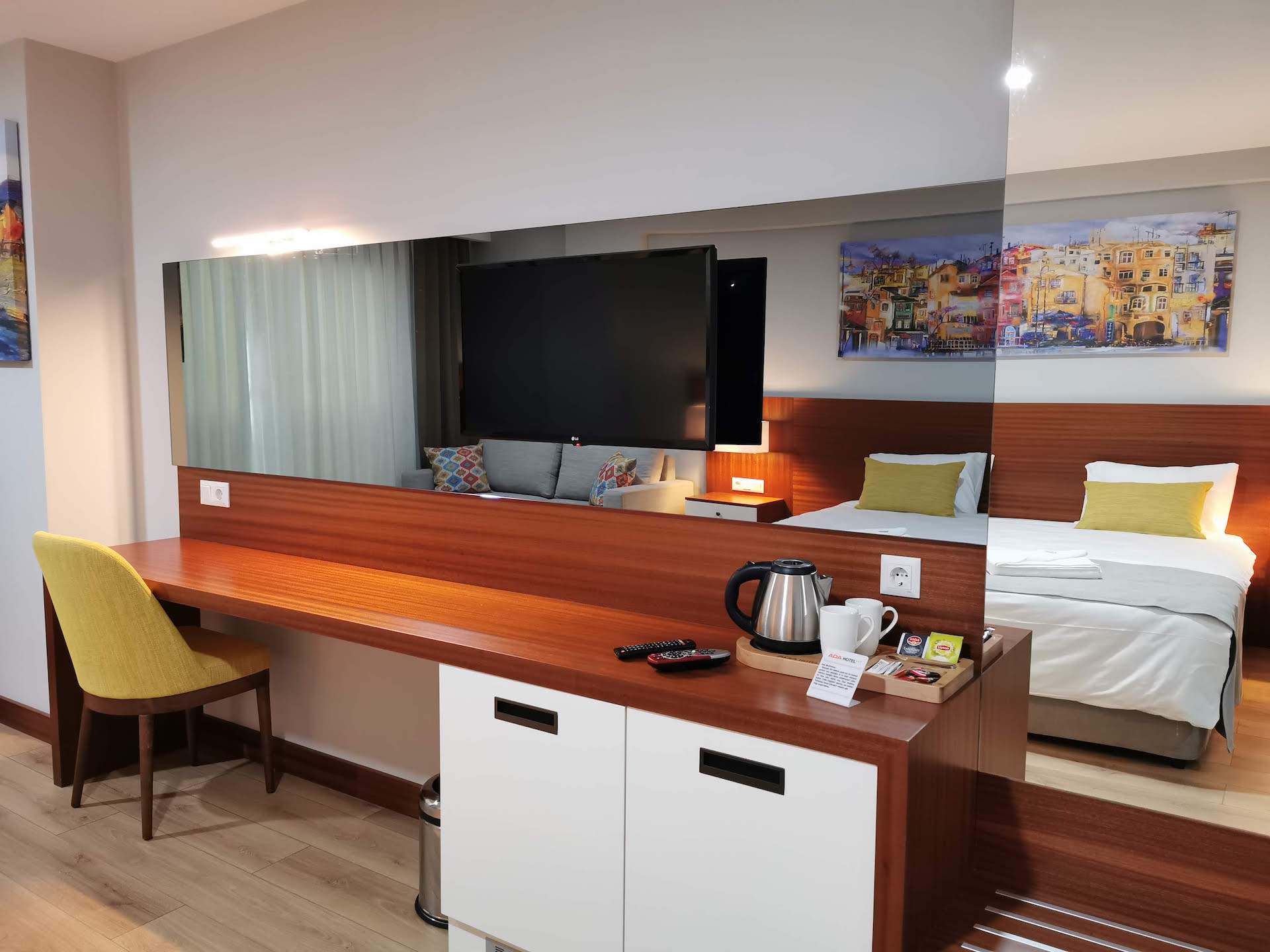 Şehirde geçen yoğun bir günün ardından dinlenmek için ideal bir seçim. Standart Double Odamız; çift kişilik konforlu yatak, sade ama zarif tasarımı ve sessiz ortamıyla huzurlu bir gece geçirmenizi sağlar. Hem iş seyahatleri hem kısa kaçamaklar için mükemmel bir tercihtir.