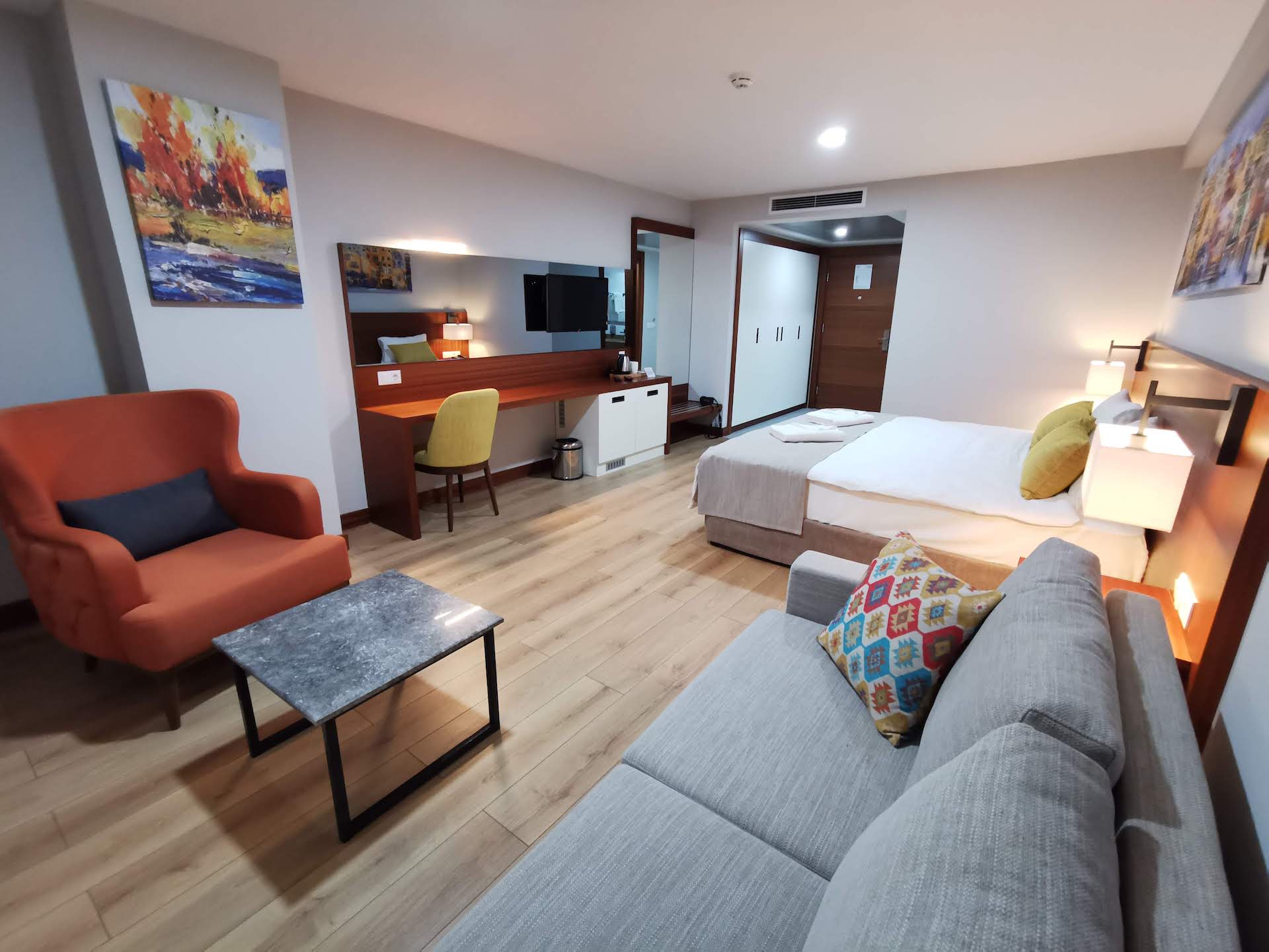 Oda içerisinde berjer ve ikili koltuk, keyifli dinlenme anları için tasarlanmış olup; 40” LG LED TV ile zengin içerik seçenekleri, çay-kahve ikramları ve ücretsiz su hizmetiyle konaklamanızı özel kılar.