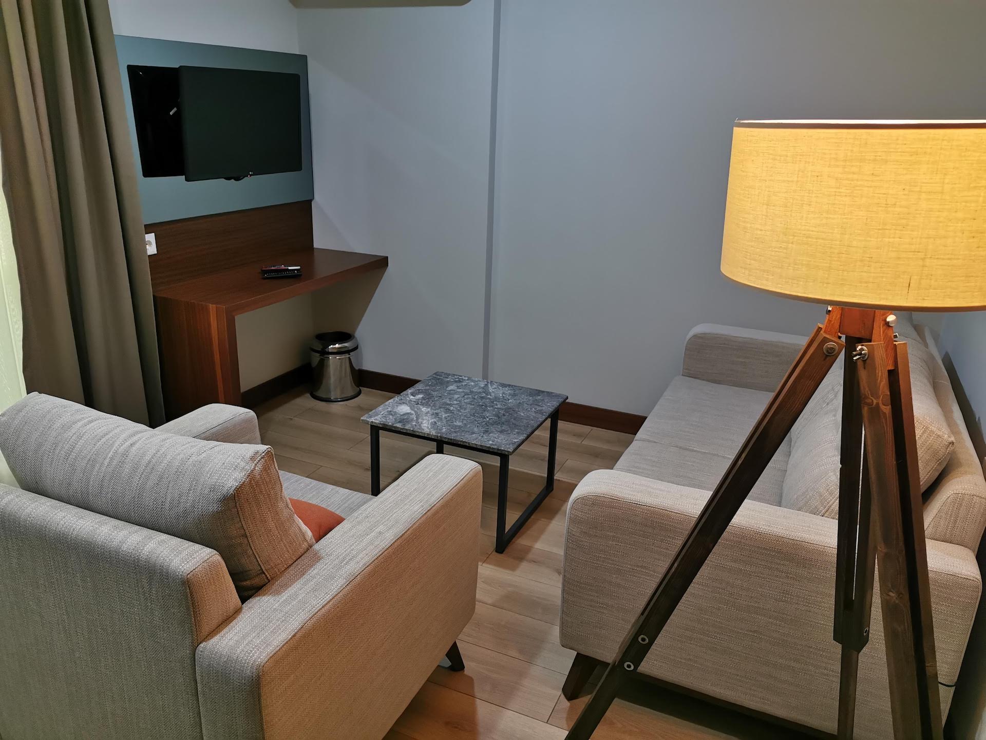 Oda içerisinde berjer ve ikili koltukla tasarlanmış rahat bir oturma alanı, 40” LG LED TV ile eğlenceli vakit geçirme imkânı sunarken; çay, kahve ve su ikramlarıyla misafirlerimize sıcak bir karşılama sunulur.