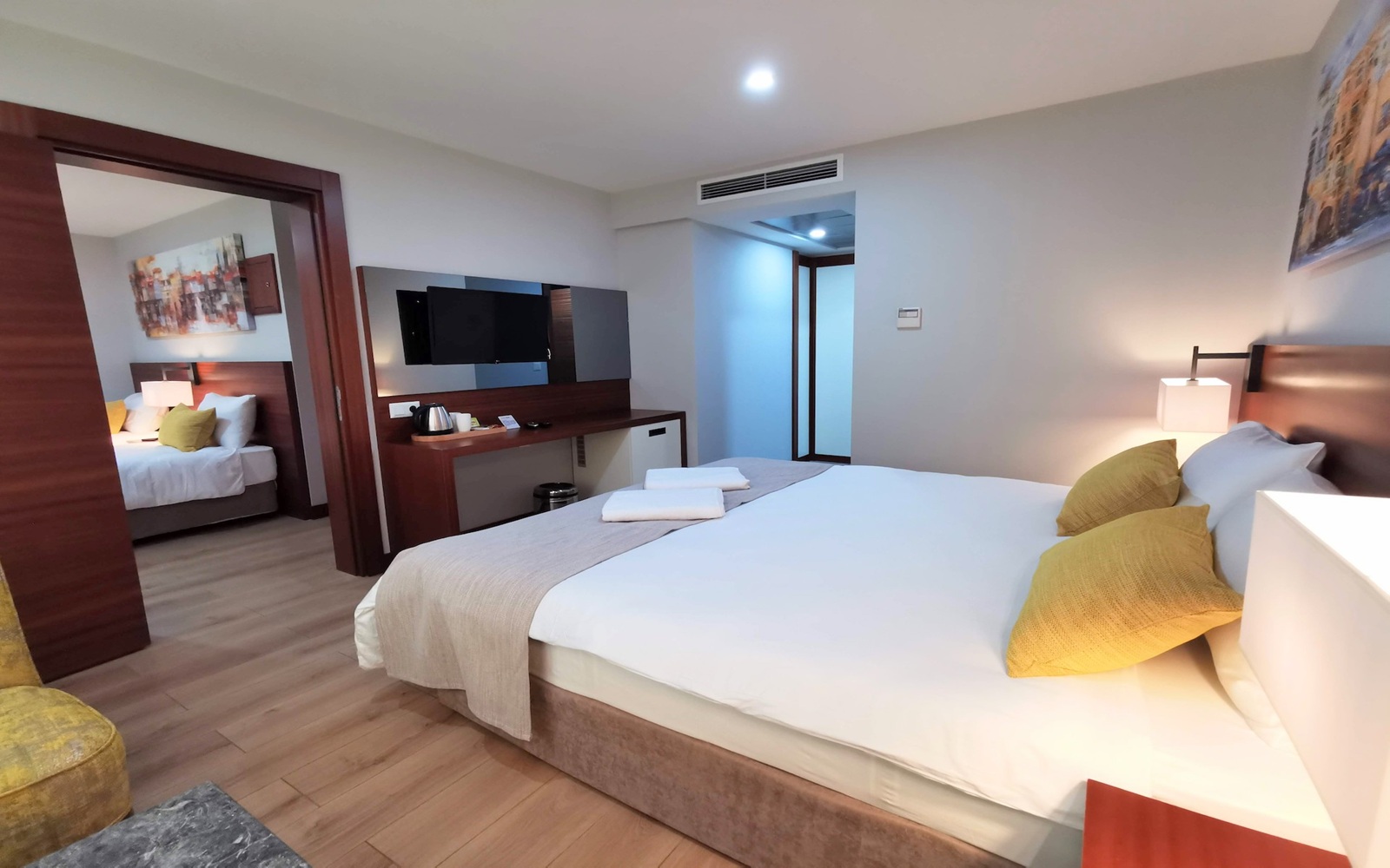 Suit Aile Odalarımız; özel tasarlanmış bir yatak odası, konforlu bir oturma alanı ve ailelerin rahatça vakit geçirebileceği geniş yaşam alanlarından oluşmaktadır.